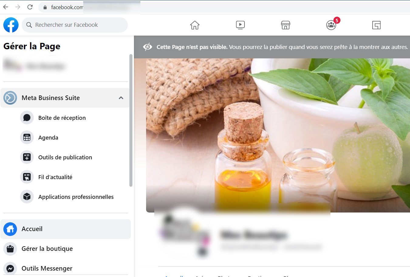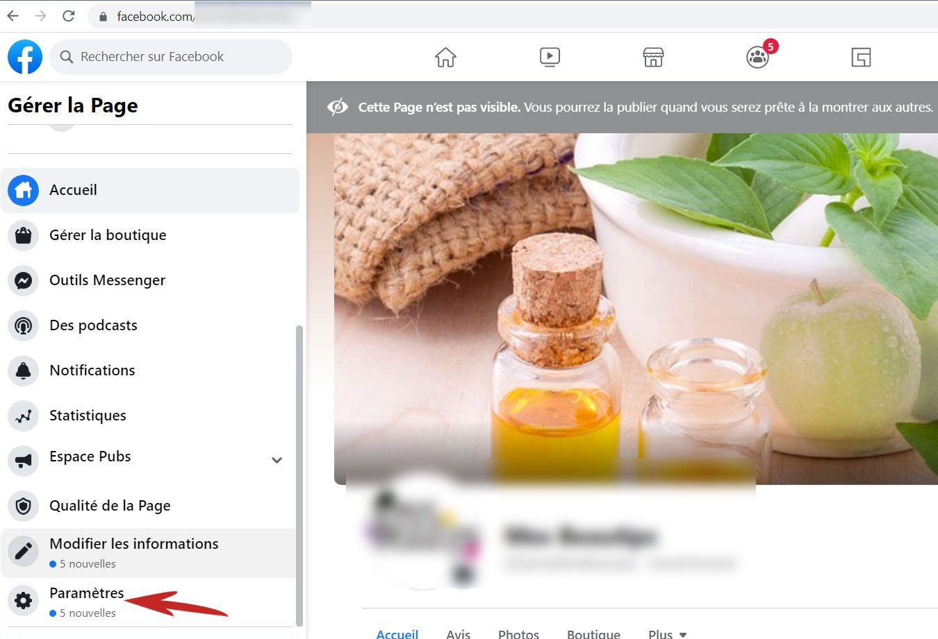 puis en bas de la page et à gauche, cliquer dans le Sous menu Vos raccourcis : Sur le nom de votre page